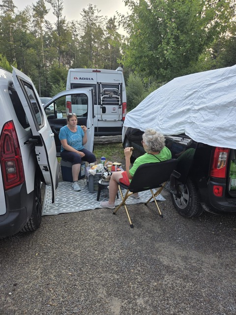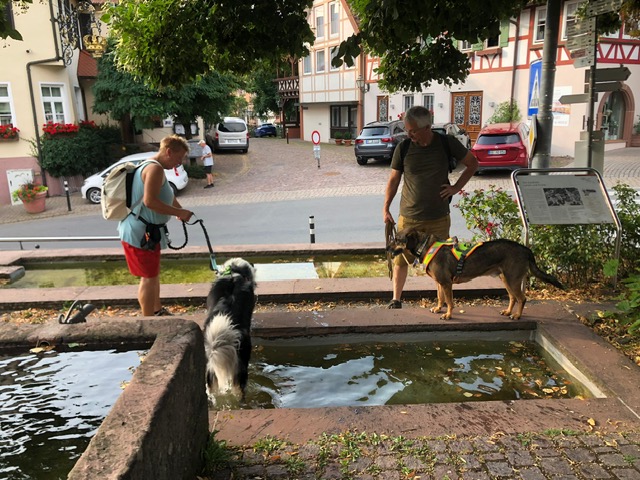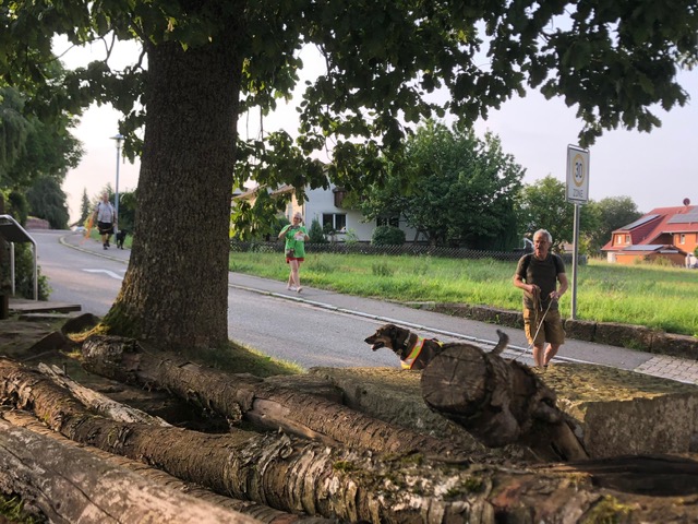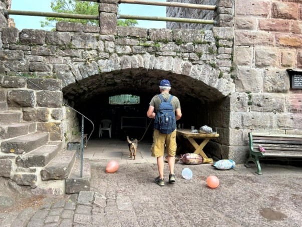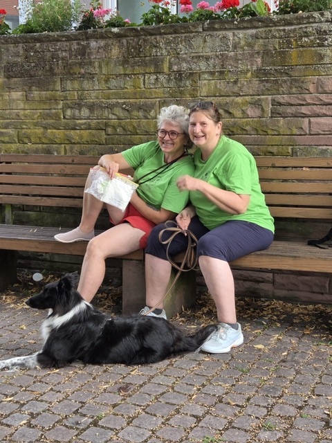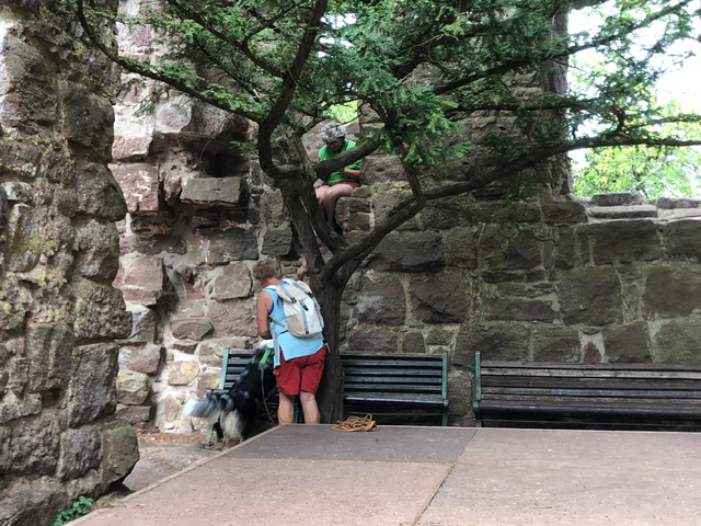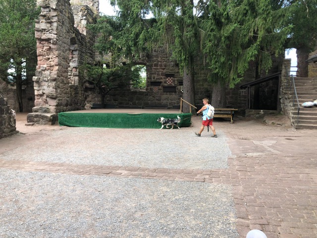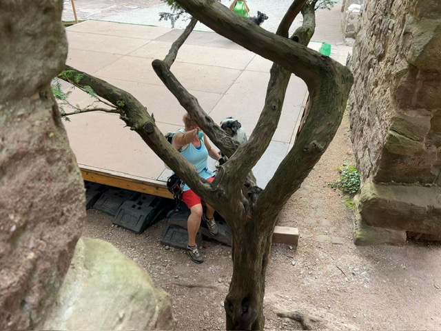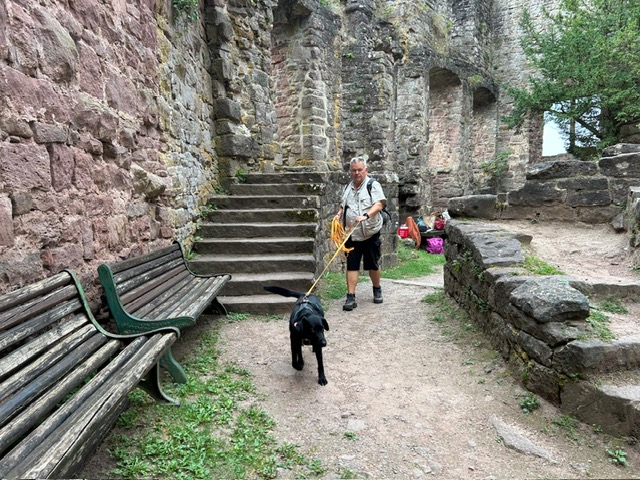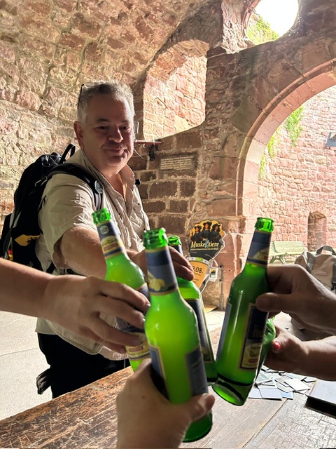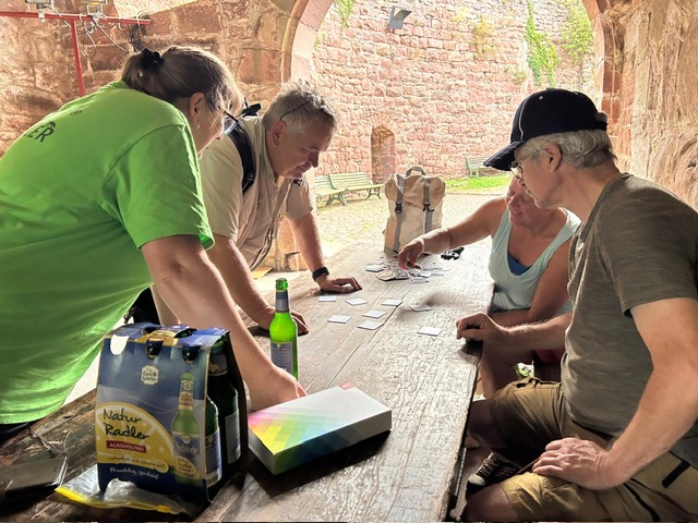 Eine kleine Sonderchallenge waren überall verteillte Luftballons und Jubelrufe einer Junggesellinnen-Feier. Aber auch diese Extra-Herausforderung haben alle Teilnehmer mühelos bewältigt. Ein kurzer Regenschauer wurde in der Torhalle der Burg dazu genutzt, den menschlichen Teilnehmernnoch eine kleine Extra-Aufgabe zu präsentieren. Sie mussten in vorgegebener Anzahl von Spielzügen ein extra dafür angefertigstes Zavelstein-Memory lösen. Als Belohnung gab es ein am Abend zuvor im Gewölbekeller gelagertes (natürlich alkoholfreies) Getränk. Im Anschluss spazierten alle zusammen zurück zum Wanderheim und schlossen den gelungenen Vormittag mit einem leckeren Essen im Biergarten ab.