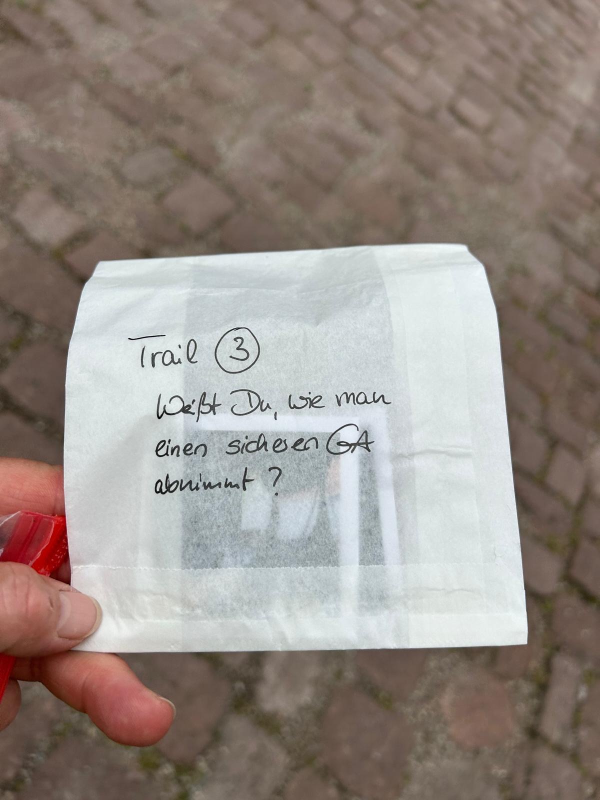 Samstag Morgen wurde – bei herrlichem Wetter – vom Parkplatz des Wanderheims aus in mehreren Etappen bis hinunter zur Burg Zavelstein getrailt. In der Burg selbst konnten die Teilnehmer beweisen, dass Trailen durchaus nicht nur eine zweidimensionale Angelegenheit ist. Erhöhte Verstecke und verschiedene Ebenen bereiteten den Teilnehmenden kleine Herausforderungen aber umso größere Freude und Erfolgserlebnisse beim Auffinden.