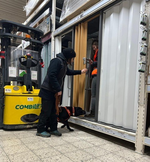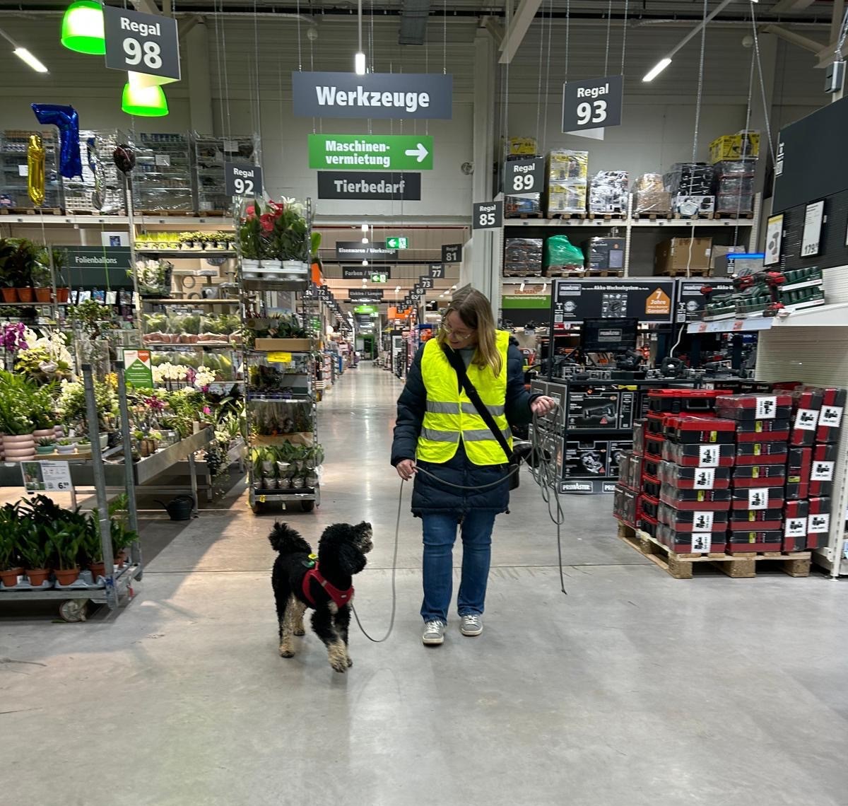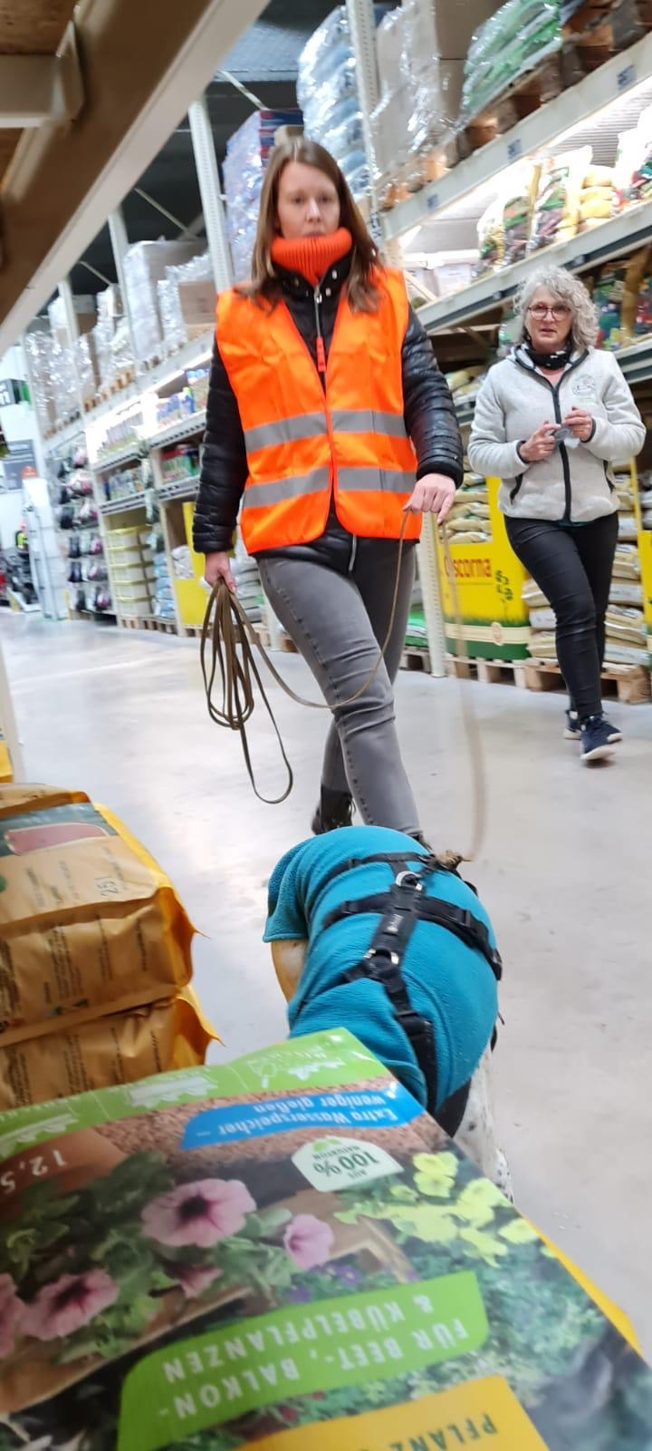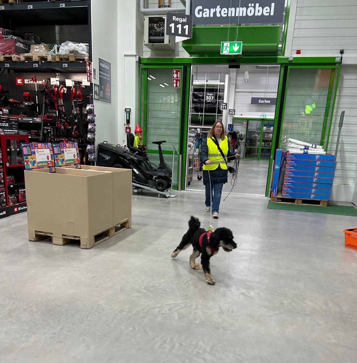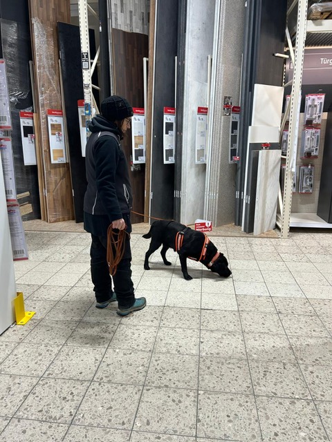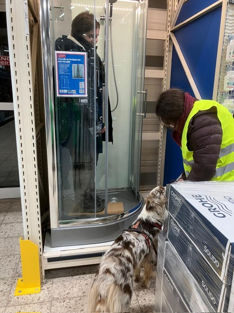 Für einige Hunde war es der allererste Indoor Trail im Globus Baumarkt in Rottenburg. Ganz schön aufregend, in den langen Gängen mit glattem Fußboden und vielen fremden Gerüchen nach der Versteckperson zu suchen. Vor allem, wenn sie hinter Türen, Paletten, Gabelstaplern, in Regalen oder Duschkabinen versteckt sind und auch noch Hundefutter auf Nasenhöhe ausliegt!